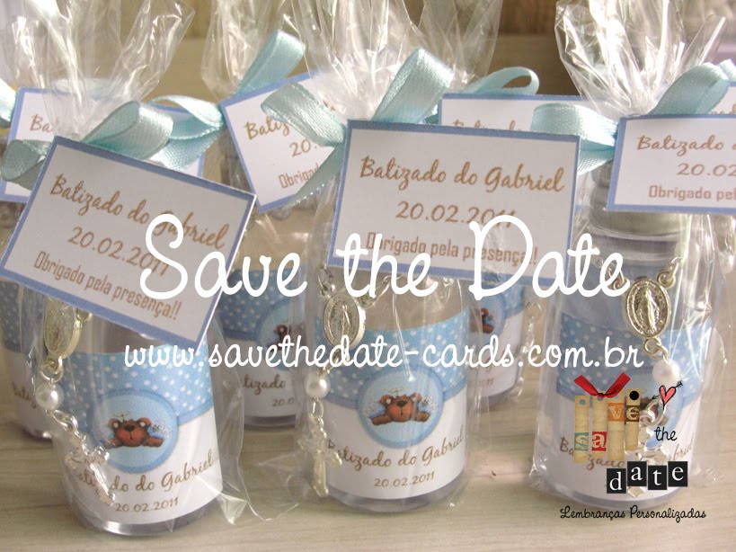 Para o batizado do Gabriel, a mamãe Kamilla (ES) encomendou 50 mini águas benta com tercinho com tema de ursinho e tons de marrom e azul.